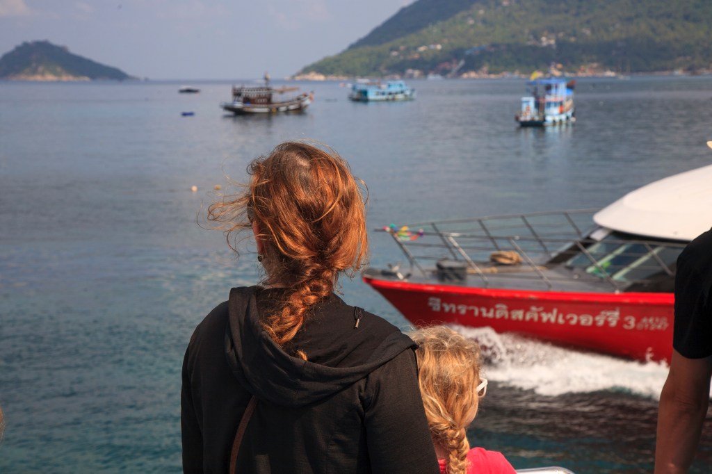Etwa eine halbe Stunde später können wir schon Koh Tao sehen und ich erwische einen jungen Mann wie er Richtung Insel blickt und träumt.